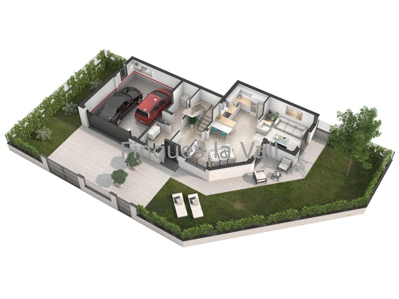 A la planta baixa hi ha un garatge per a dos cotxes, cuina oberta amb menjador sala d’estar, bany amb plat de dutxa, safareig i jardí amb pati d’uns 165 m2.